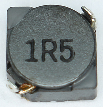 文字符號法是由數(shù)字和文字符號組成,按照一定的規(guī)律把電感的標(biāo)稱值和偏差值標(biāo)示在電感上面。這種表示方通常用在一些小功率電感上面,單位一般是nH 或pH分別用“R”和“n”表示小數(shù)點(diǎn)。如下圖是某電感用文字符號法表示的,這里1R5則表示電感量為1.5 μH。
